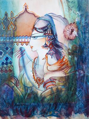 On the other hand, Hajra Mansur’s themes include Moghul miniature art and romances of the golden age of Pakistan, which have delighted her audience in Pakistan and Worldwide. She takes inspiration from the South-Asian beauty ideals in women and exaggerates them. Elongated eyes, vibrant skin, and articulate hand gestures, at times carrying birds like pigeons and peacocks, are a sign of Hajra Mansur. Another one of her inspirations is Abdur Rahman Chughtai, who was a highly skilled painter artist from Lahore, Pakistan. Chughtai created a distinctive painting style that was derived from and influenced by Mughal art.